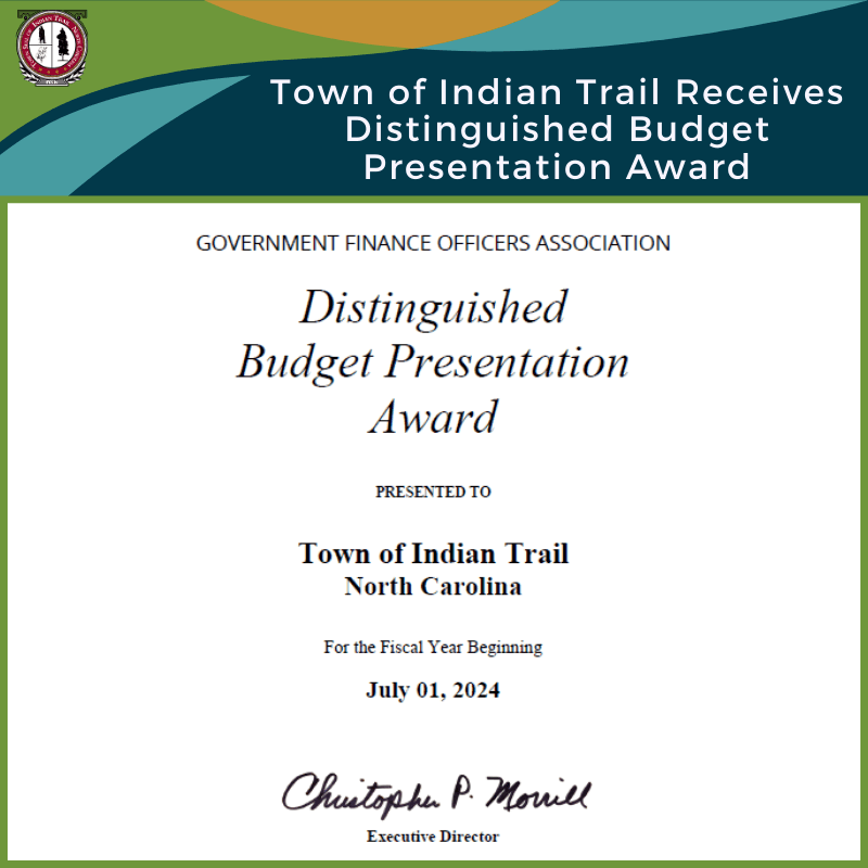 The Town of Indian Trail is pleased to announce it received the Government Finance Officer Association’s (GFOA) Distinguished Budget Presentation Award for its Fiscal Year (FY) 2024-2025 budget. The Town has received the award for the second consecutive year. The Distinguished Budget Presentation Award is the highest recognition in governmental budgeting.