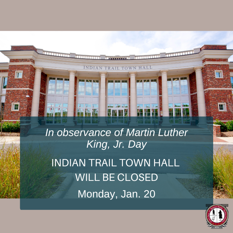 The Indian Trail Town Hall will be closed on Monday, Jan. 20, in observance of Martin Luther King, Jr. Day. We will resume normal business hours on Tuesday, Jan. 21, at 9 a.m.