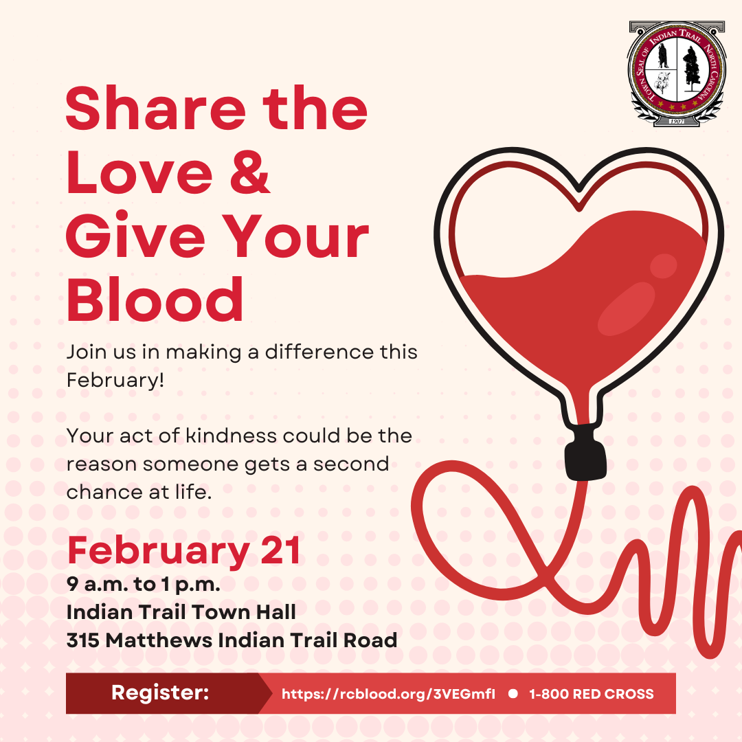 The Town of Indian Trail is hosting its first blood drive of the year on Friday, Feb. 21, from 9 a.m. to 1 p.m. in partnership with the American Red Cross. The blood drive will be in the Shirley Howe Community Room at the Indian Trail Town Hall (315 Matthews-Indian Trail Road).