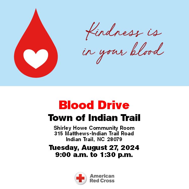 The Town of Indian Trail is hosting its summer blood drive on Tuesday, Aug. 27, from 9 a.m. to 1:30 p.m. in partnership with the American Red Cross. The blood drive will be in the Shirley Howe Community Room at the Indian Trail Town Hall (315 Matthews-Indian Trail Road).